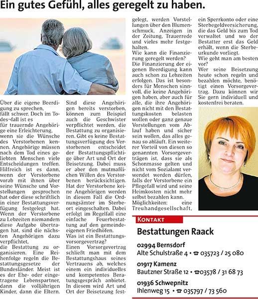 Entscheidung, mit 20 Jahren in den elterlichen Betrieb einzusteigen, nie bereut. Mein Mann Mario Rösler kam später dazu. Seit 1991 gibt es Bestattungen Raack, mittlerweile mit Geschäftsstellen in Bernsdorf, Kamenz und Schwepnitz. Zuvor war mein Vater Dieter Raack, Gründer der Firma, Bauleiter und meine Mutter Monika Raack führte eine Gaststätte. Der Anlass für den Berufswechsel war ein ganz persönlicher. Eine Bekannte war